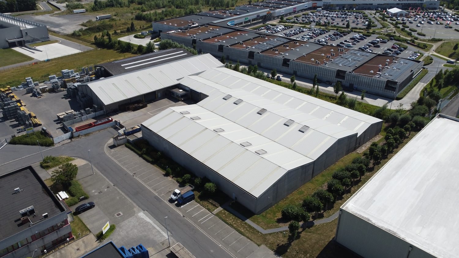 De site is uitgevoerd in een kwalitatieve betonstructuur met silex- en baksteengevels, een zadeldak met rookkoepels en lichtstraten, en duurzame gepolierde betonvloeren. Dankzij de lichtstraten beschikt het magazijn over een natuurlijke lichtinval die het gebruikscomfort verhoogt.