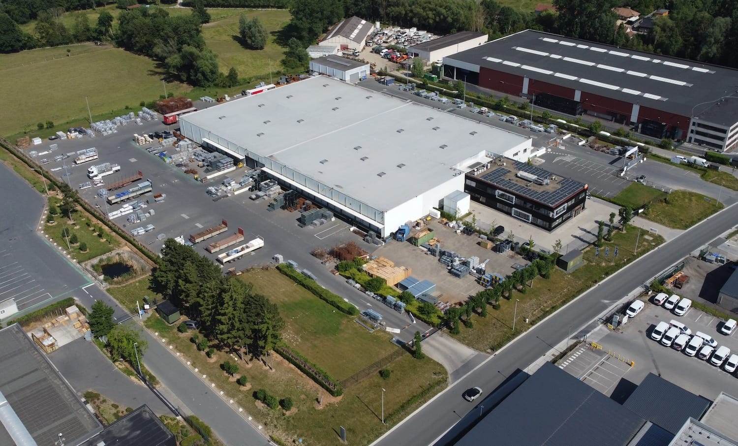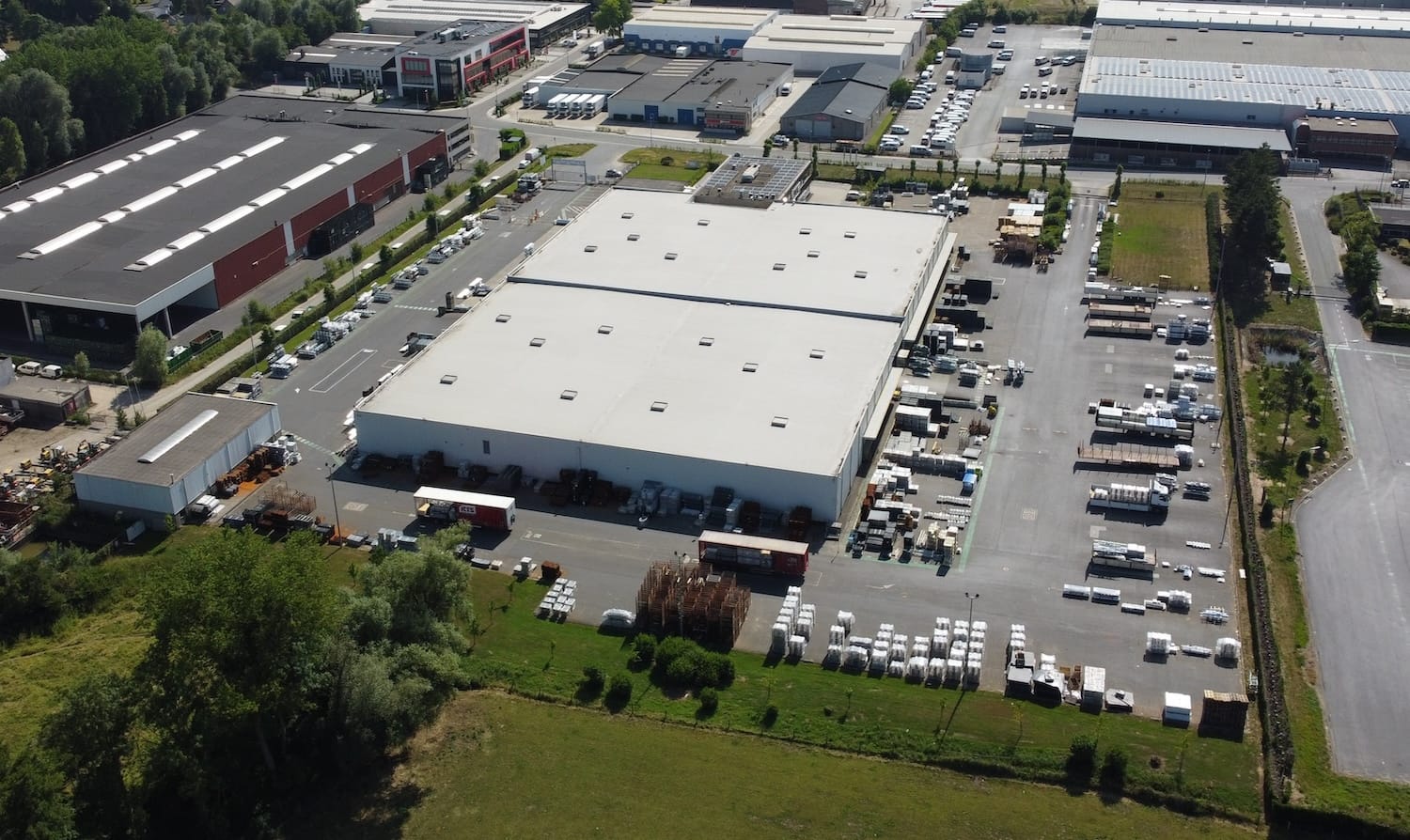 De ruime buitenzones bieden bijkomende opslagmogelijkheden en manoeuvreerruimte. De volledige site is omheind en beveiligd, met parkeergelegenheid voor zowel medewerkers als vrachtwagens.